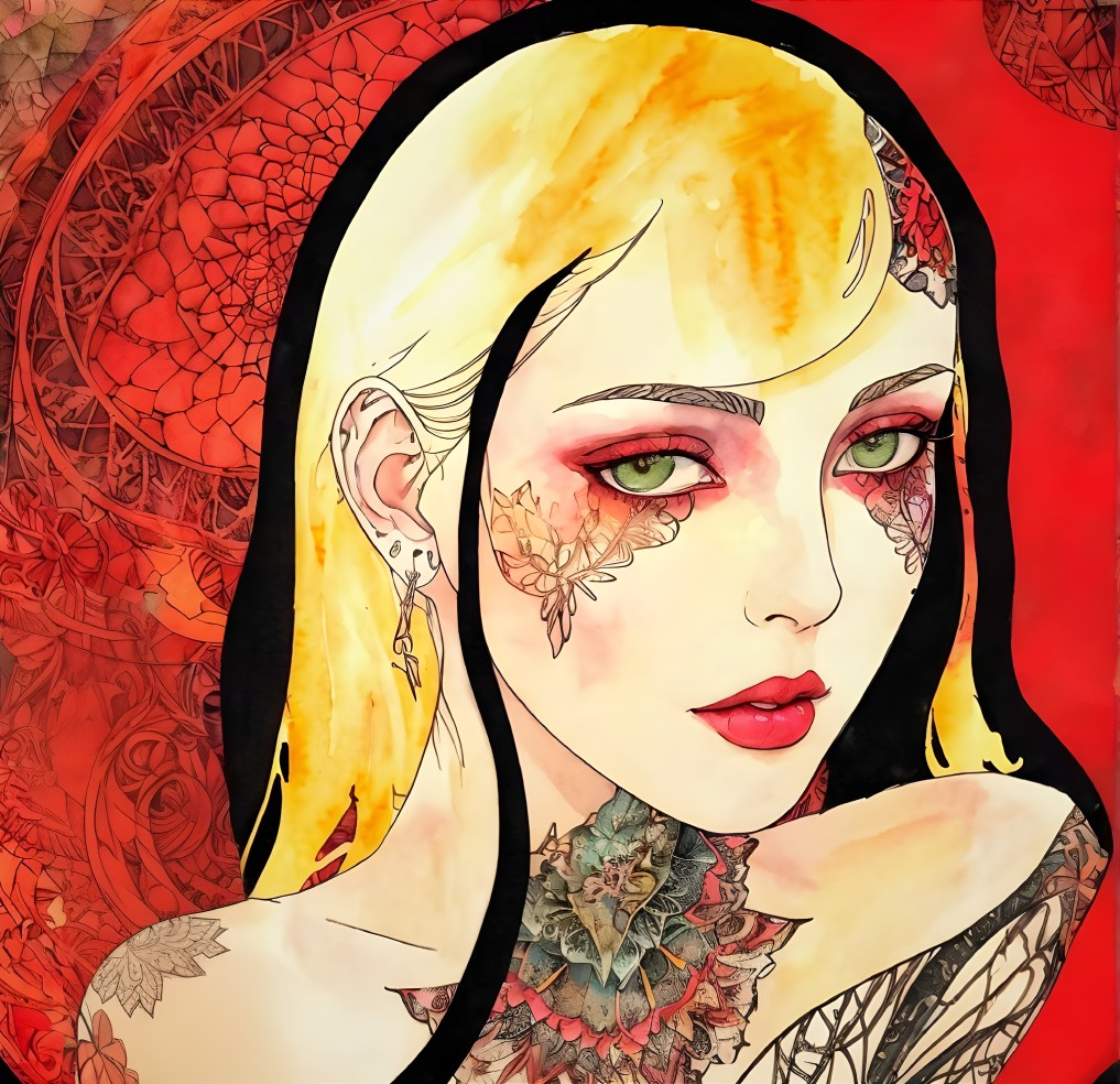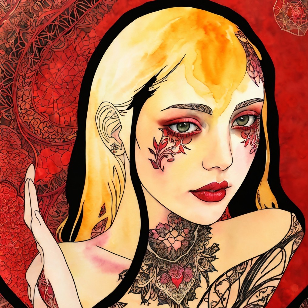 Prompt: Watercolor portrait of a female temptress, ethereal,, mystical, Side view, She has pale skin,dyed,Watercolor details, inkpunk 1.3, golden ratio,line drawing with filament elements, outline illustration blended with fauvistic fractalization, watercolor and ink style, comic book art 1.7, intricately patterned with black and red zentangle lines in glowing orange, acrylic ink, soft and acetate texture, vibrant colors, red golden hairstyle, white sparks scattered around, tall and lean details, windy streaks, flowing hair illusion, art nouveau atmosphere, dynamic movement, serene and dethereal, detailed brushwork, warm and soft lighting, triadic color scheme beige red orange, hues, close-up, stylized lineage illustration, remiscent of stencil style,uhd, hdr, octane render illustration 1.5, streamline_moderne, gothical, softened rounded edges, quilling, delicate coloring 1.3 in withered pale colors, american gothic 1.7, rim dynamic lighting, tints of aquarelle, auracore, 3d effects, anisotropic filtering, limited palette, 3 layers of dof, dreamscape, on cracked canvas blurring reality: 3D digital painting, divine silky skin, Paint dripping and flares, 8k, beautiful, liquid mercury, sensual, colorful, viscous paint splash in a place of swirling psychedelic paint pour, fashion magazine, 4k, background twisted paint in a stunning way, dethereal feelin, pristine skin sleek fantasy art-inspired, fabric textures in watercolor and ink, acetate, grunge, coherent, octane render illustration 1.5, fauvistic fantasy movie still, Woodblock print intertwined with colored lineage drawing, line-art, 3d effects, line drawing with filament elements, outline illustration blended with realism and fractalization, watercolor and ink style, comic book art 1.7, raw fantasy art merged with gothical otherworldliness. Style of Georgia O'Keeffe,.Pierre-Yves Riveau, emanuele taglietti, Arlie Opal, William Bradley, otherworldl, mystique, geometric aesthetic integrity of lines & shapes. precision