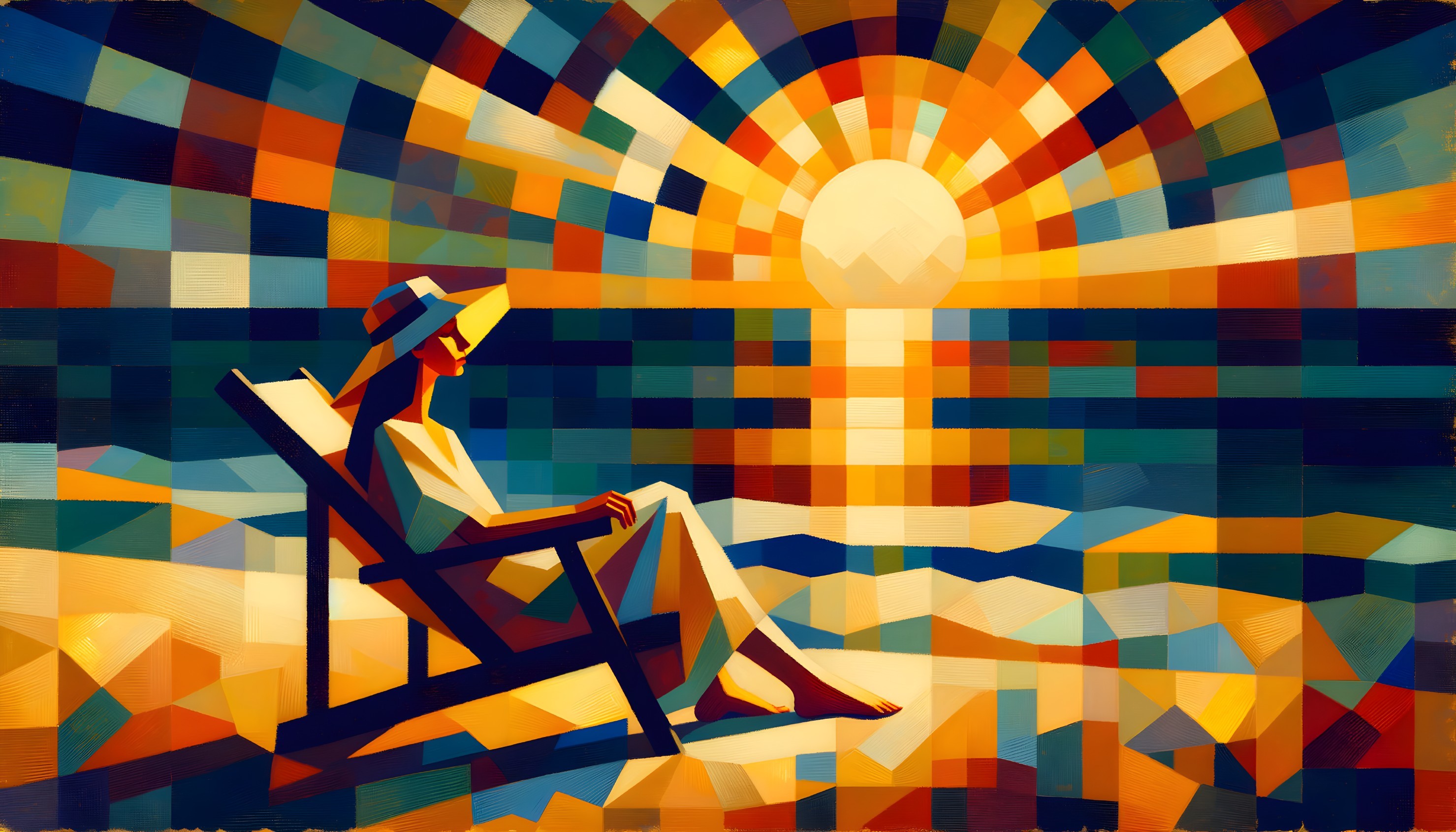 A stylized image depicts a person lounging in a chair with a radiant sunburst pattern behind them, rendered in a geometric, cubist art style.