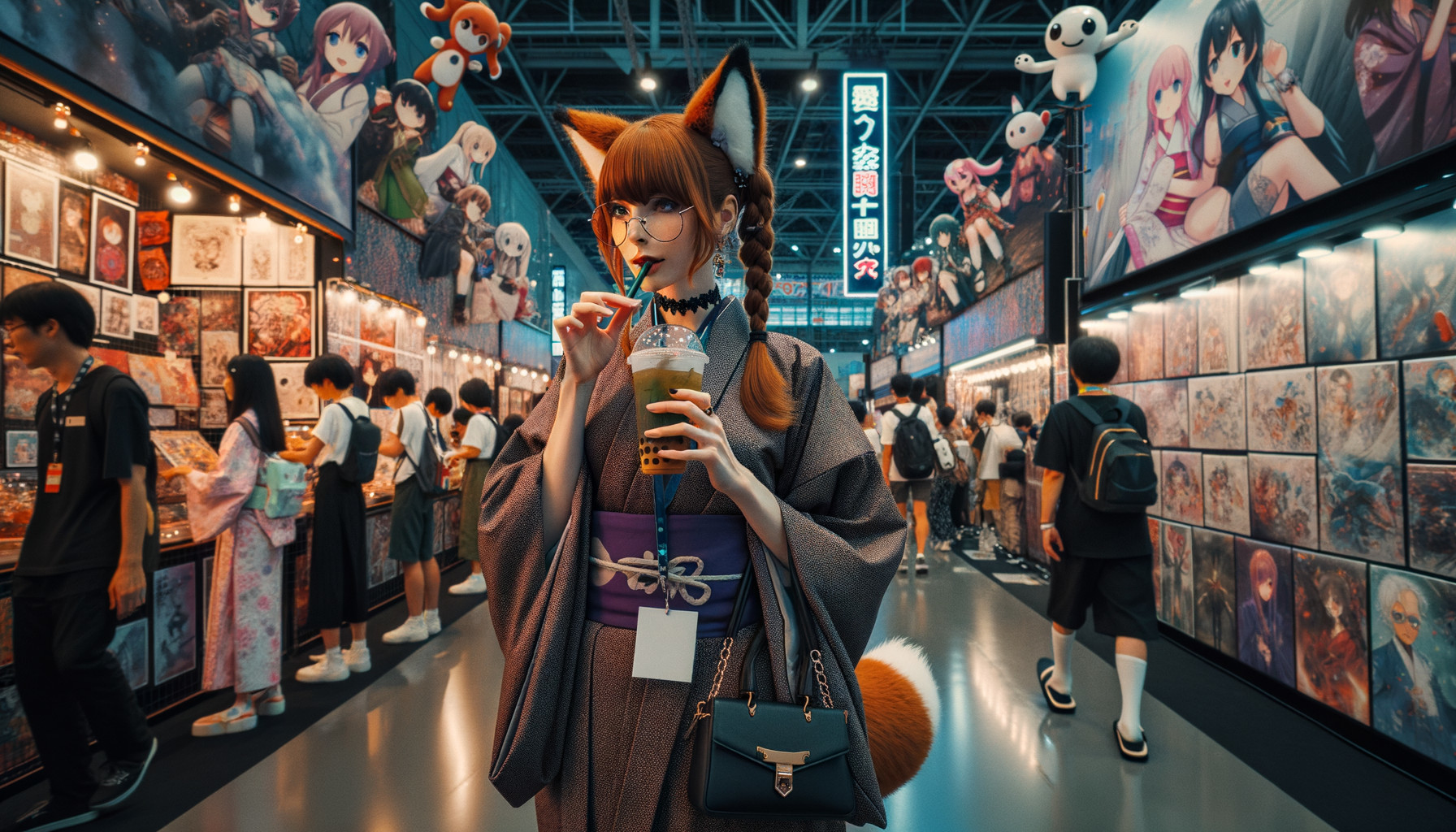 A girl with fox ears and a kimono enjoys a beverage in a bustling indoor market adorned with lanterns.