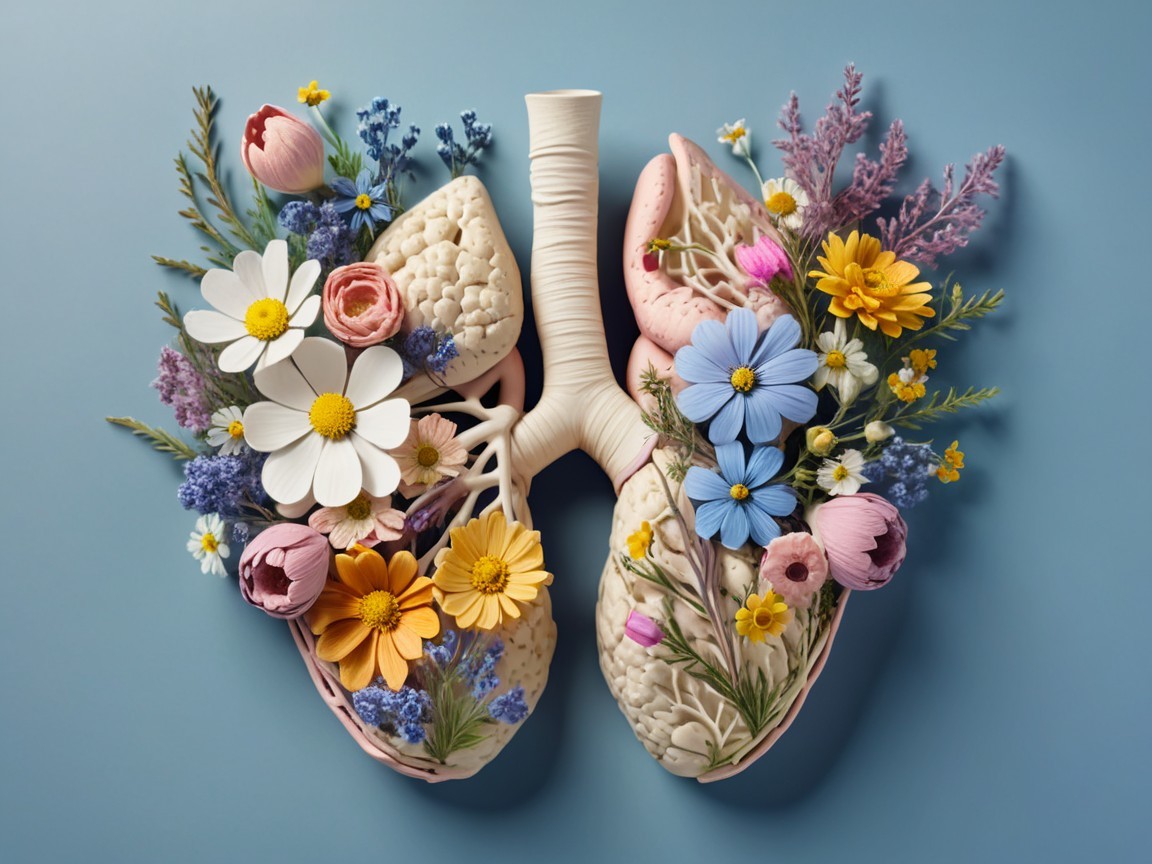 A whimsical artistic representation of lungs, adorned with vibrant flowers and foliage, set against a soft blue background, symbolizing breath, life, and natural beauty.