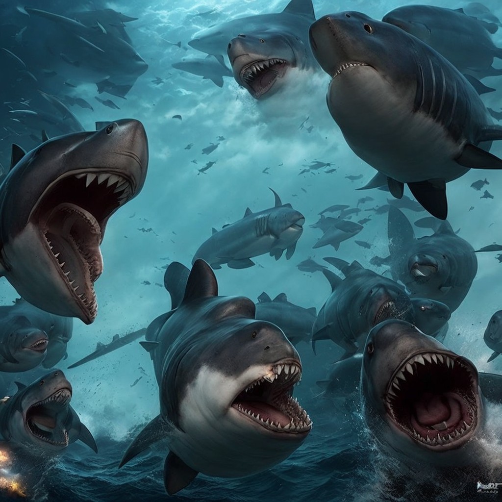 Fierce Sharks Swimming Under Stormy Sea Conditions