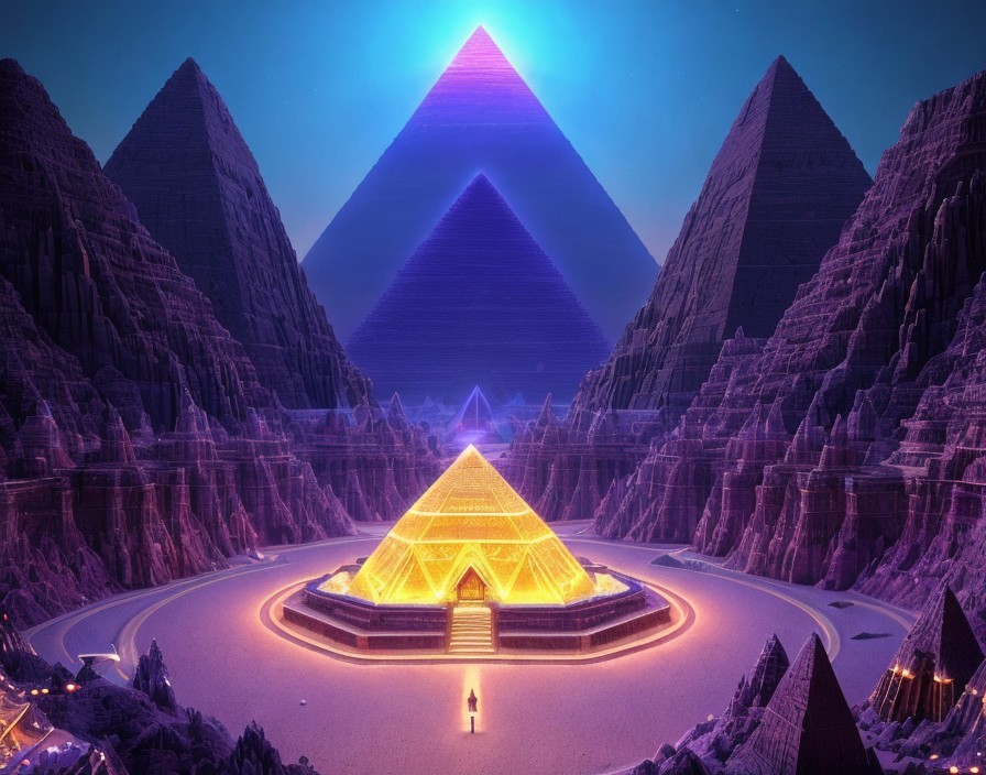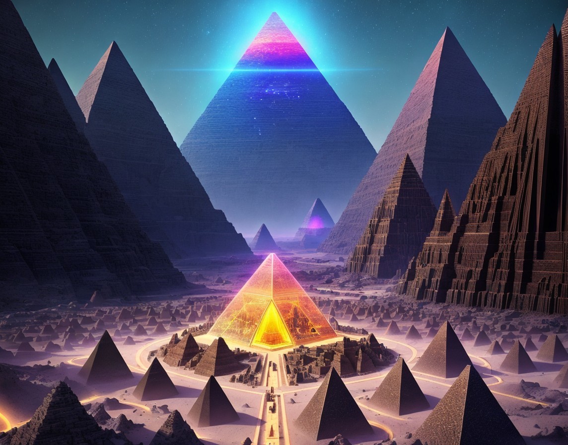 An imaginative depiction of the Egyptian pyramids at night with a glowing, futuristic pyramid center stage and mysterious cosmic symbols shining above.