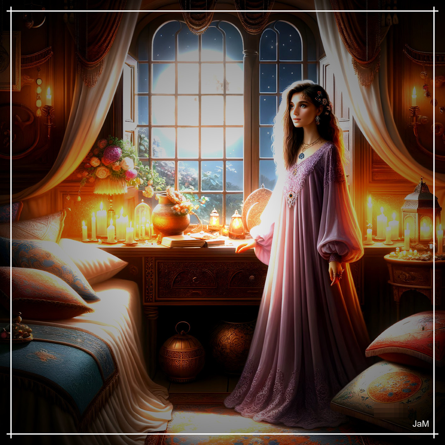 In a cozy, magical bedroom on a full moon night, a beautiful young woman with brown hair gazes out the window in her pastel purple nightdress. The room is adorned with decorative pillows, knick-knacks, and flickering candles, creating a warm and enchanting atmosphere in this elegant and detailed digital painting.
