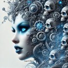 A striking portrait of a model with intricate silver and blue accessories, featuring metallic elements in her hair and sparkling makeup, exuding a futuristic and ethereal vibe.