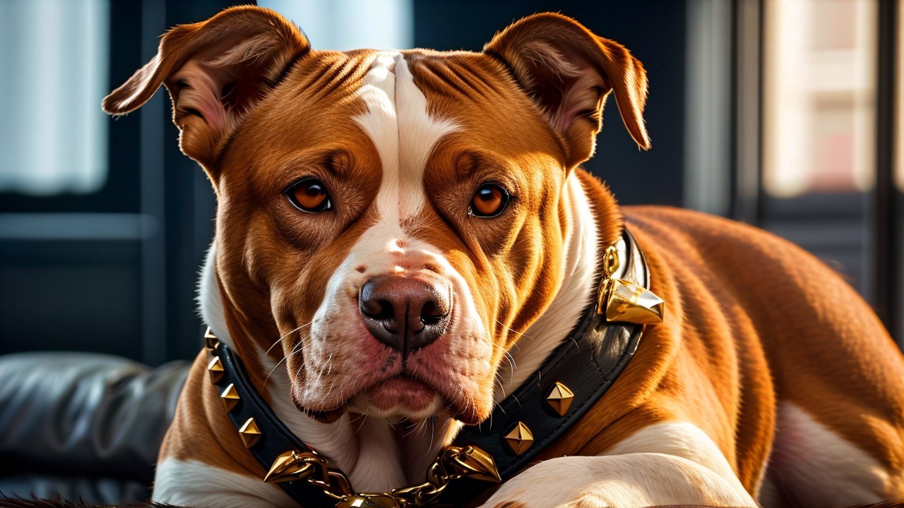 A close-up of a muscular dog with a fierce expression. Its mouth is open, displaying sharp teeth, and its eyes are intense. The fur is a mix of brown and white, highlighting its strong features.