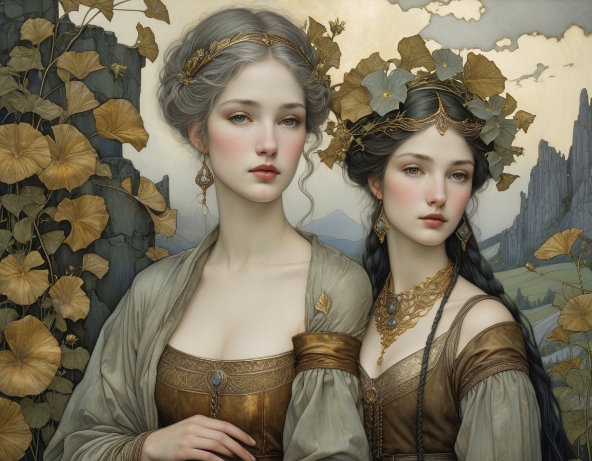 Two elegant figures stand side by side, adorned in intricate, flowing garments. Soft, ethereal lighting enhances their serene expressions, while nature-themed accents add a mystical touch.