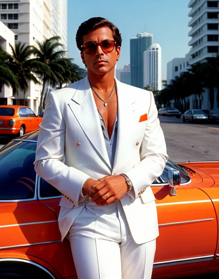 Prompt: "Sharp criminal old caucasian buisnessman from Miami. White suit. Big orange glasses. Wealthy. 1990s. Leaning on Rolls Royce. Miami detail and background."