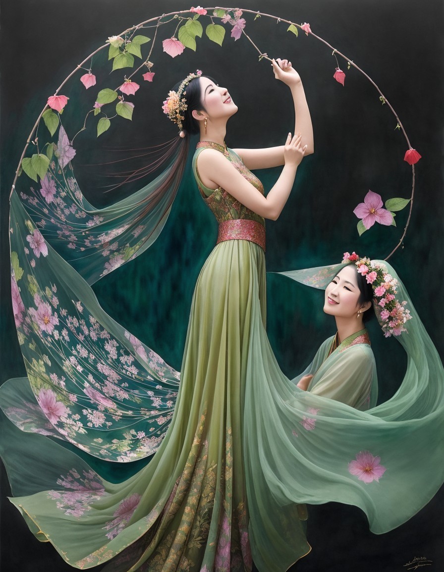 A serene artwork depicting a woman in flowing attire with a lantern, surrounded by lotus flowers against a moon backdrop.