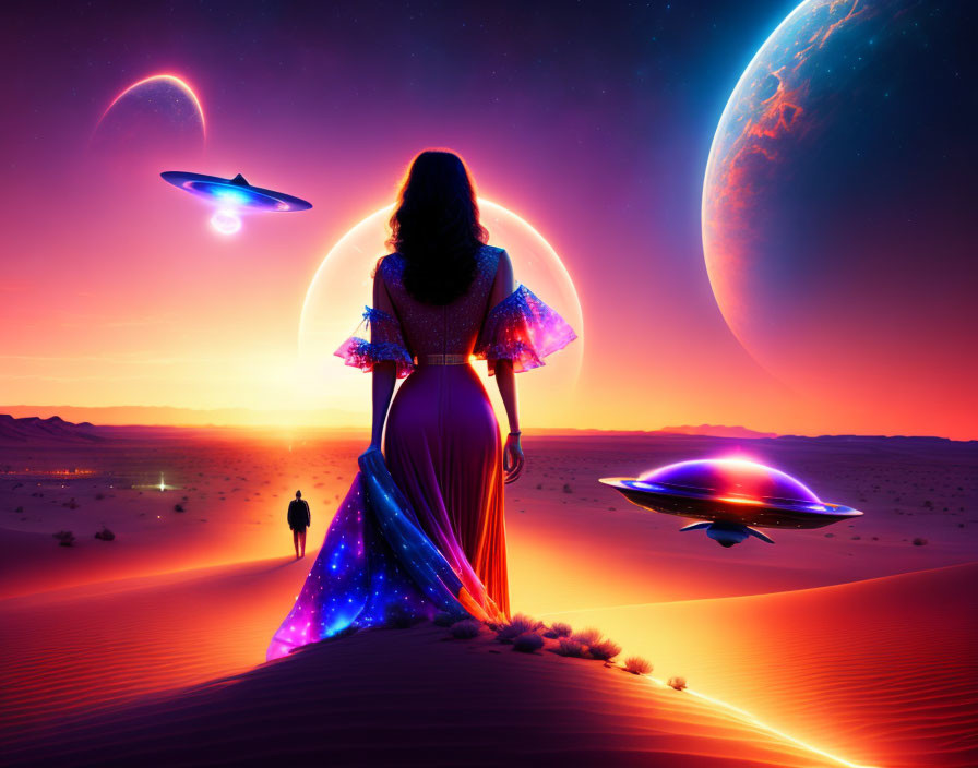 back view woman in colorful summer dress and man in jeans and t-shirt witness a flying saucer UFO landing at night in the desert; alien silhouette in light beam