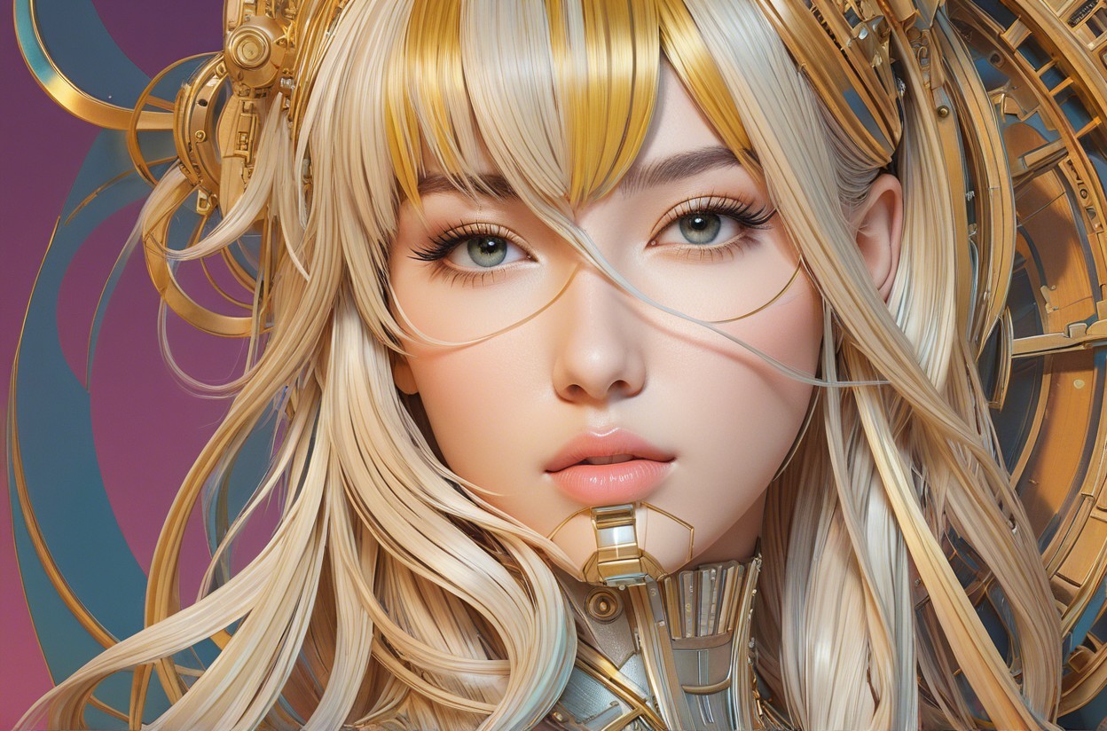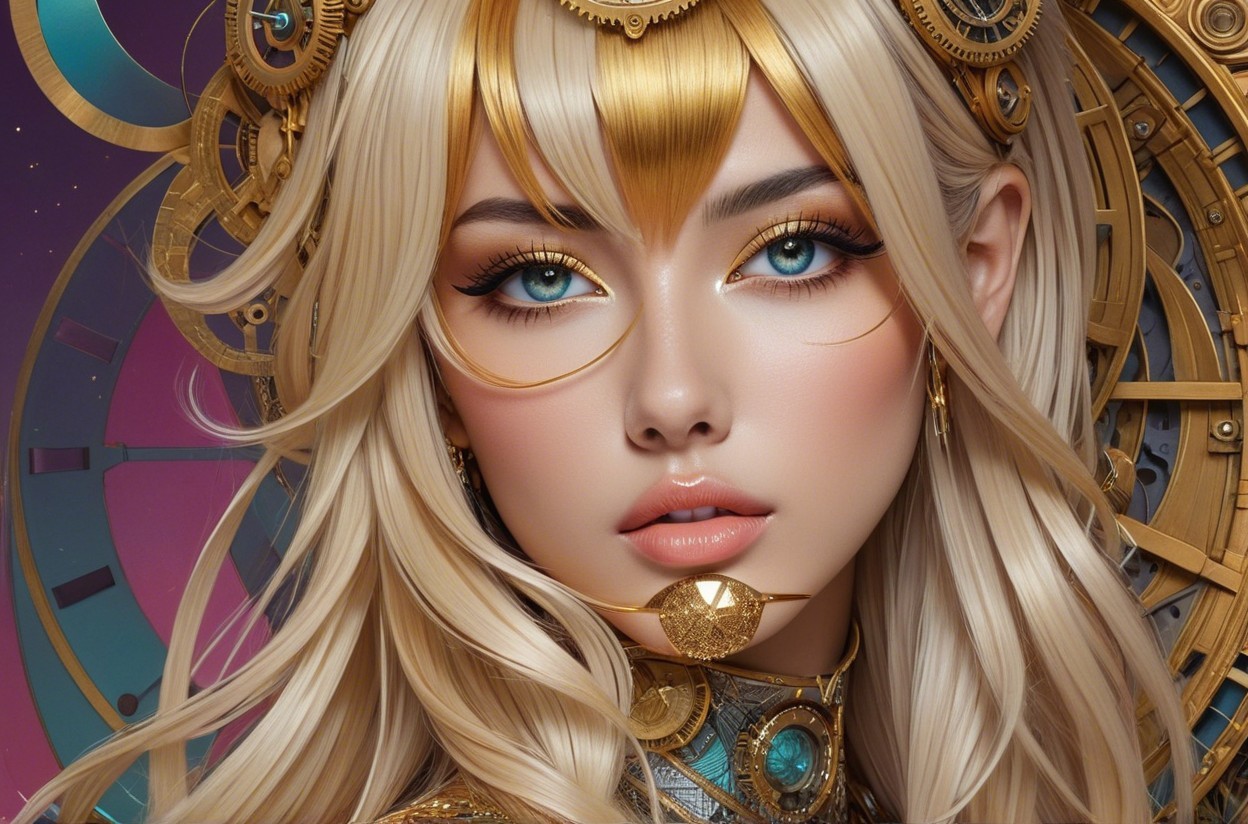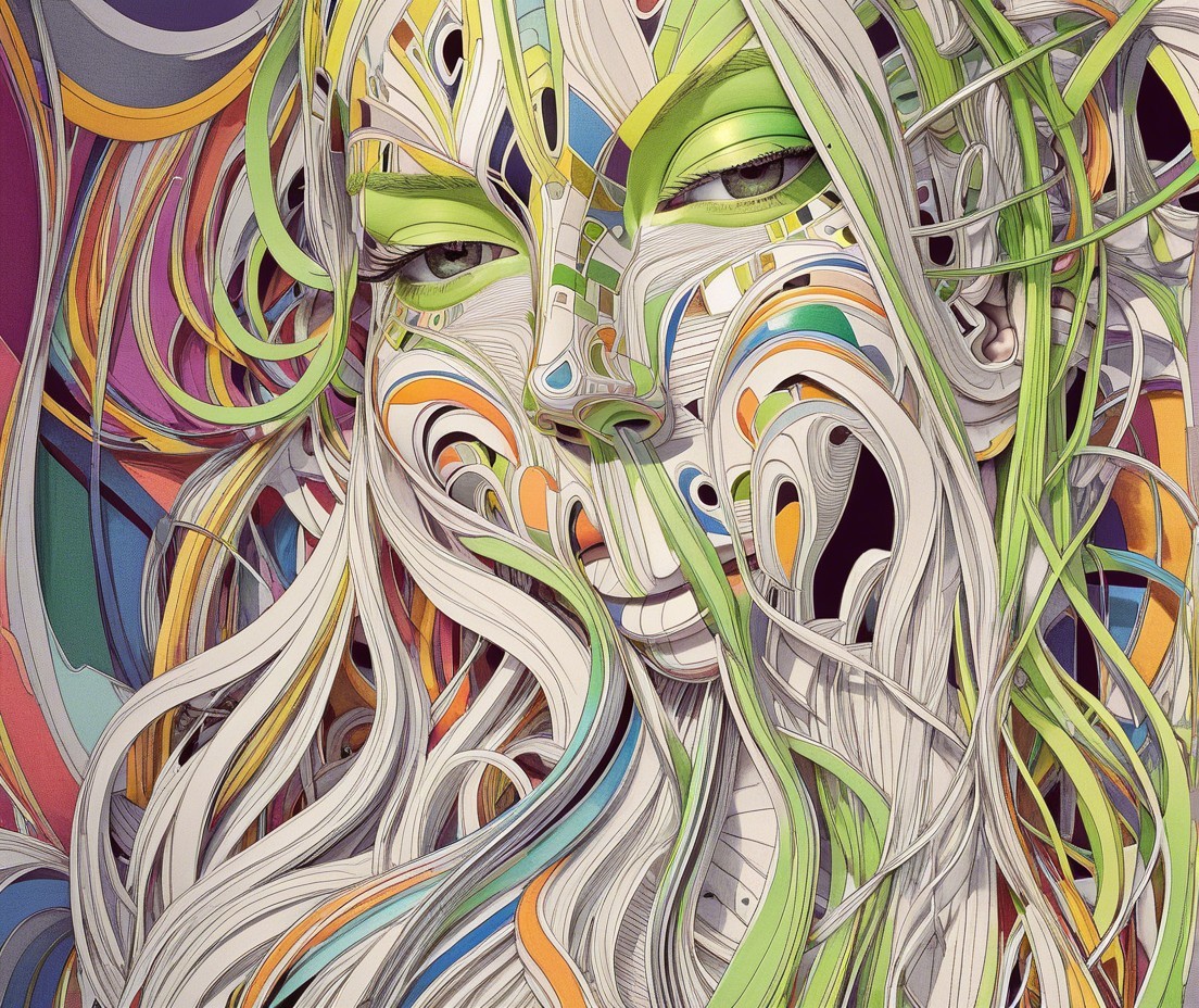Prompt: Masterpiece pencil and ink extrusion by Rashid Nurmukhametov, captivating headshot with beautiful retropunk elements, intricate geometrical and zentangle patterns, fantasy fusion with metallic sparkling details, featuring warm hues and subtle lining. The portrait showcases a gorgeous face with multi-layered eyes, long tesselated hair, and tiny outlines, accentuated by golden glitter splashes. The symmetrical, layered geometrical patchwork design is complemented by oversprays of paint by josephine Wall, alcohol ink, in the style of Paul Klee, William Turner, Arlie Opal, ho Baron, Alphonse Mucha, stylized Patchwork, overall composition by Rufus Dayglo, hues, dyed, action painting reminiscence, simplistic, contoured, hallucinogenic, dappled rim lighting. Surrealist psychopomp theme,hyper-realistic, motion blur, ethereal, dreamlike, long-exposure,foampunk, close-up photography, fragmented, watercolour and pen, fantasy-inspired, whimsical, hyper-realistic, markers and ink painting, sharp focus, fantasycore, enhanced by 64K rendering and 3D effects. The lineage drawing is coherent, overspray of color, reflections, glossy, quilling, quaint, complemented by dynamic lighting effects. The stylized portraiture features a colorful palette, incorporating novelty architecture and precise Gelsculpt 64K details. Subsurface scattering and parallax occlusion techniques enrich the artwork, along with raytraced shadows.Warm colors of yellow and red dominate the composition, following a triadic color scheme of beige, silver, and auburn. LiDAR point cloud and paper fibers texture the piece, creating a tessellated and stippled effect. Reminiscent of 1960s space age style, overall composition by NORMAN SAUNDERS.