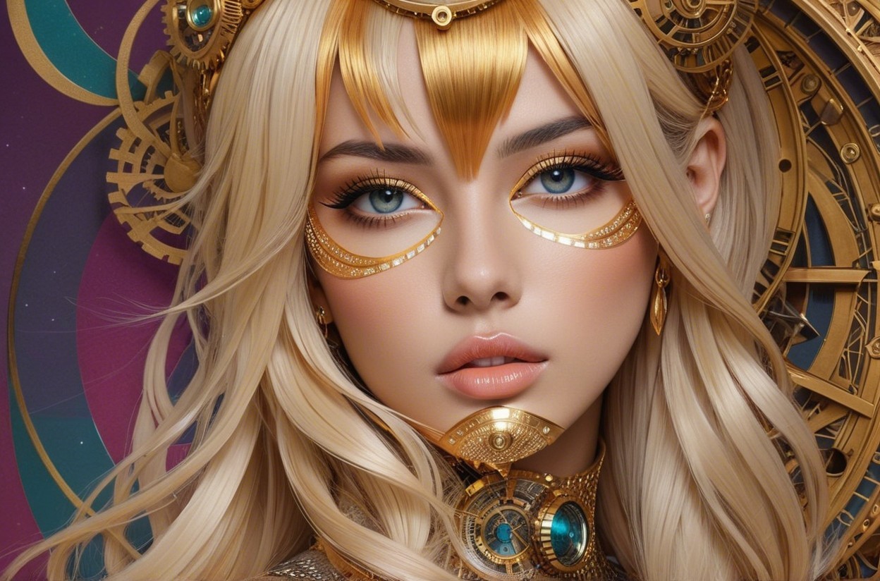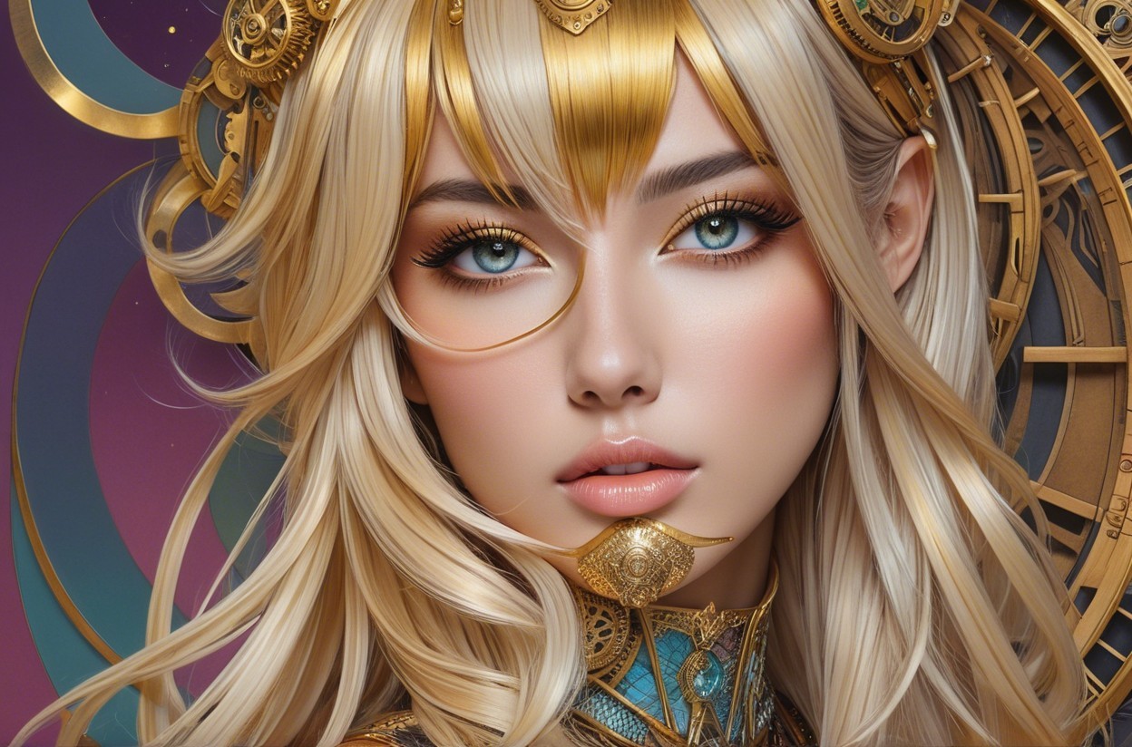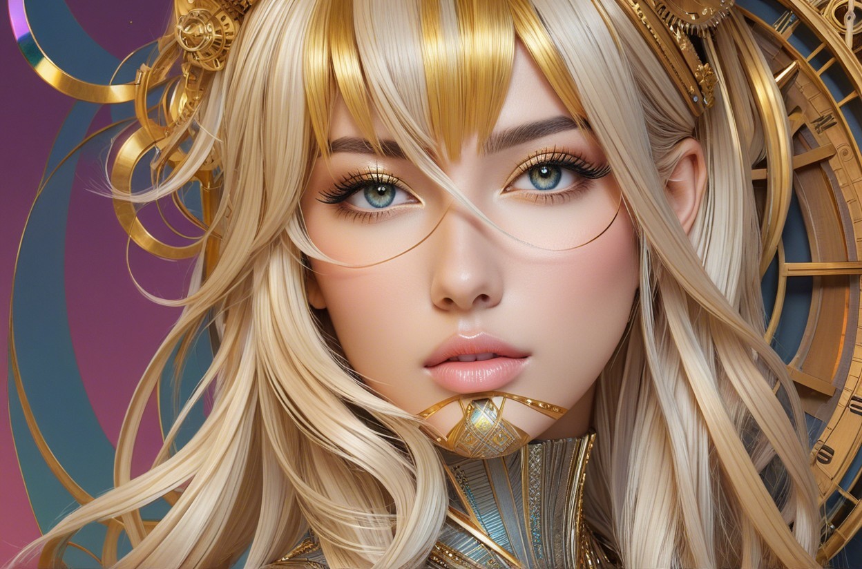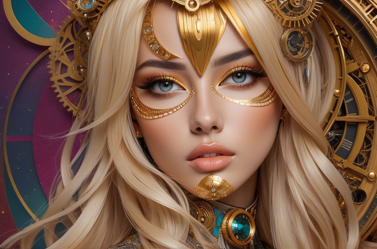 Masterpiece pencil and ink extrusion by Rashid Nurmukhametov, captivating headshot with beautiful retropunk elements, intricate geometrical and zentangle patterns, fantasy fusion with metallic sparkling details, featuring warm hues and subtle lining. The portrait showcases a gorgeous face with multi-layered eyes, long tesselated hair, and tiny outlines, accentuated by golden glitter splashes. The symmetrical, layered geometrical patchwork design is complemented by oversprays of paint by josephine Wall, alcohol ink, in the style of Paul Klee, William Turner, Arlie Opal, ho Baron, Alphonse Mucha, stylized Patchwork, overall composition by Rufus Dayglo, hues, dyed, action painting reminiscence, simplistic, contoured, hallucinogenic, dappled rim lighting. Surrealist psychopomp theme,hyper-realistic, motion blur, ethereal, dreamlike, long-exposure,foampunk, close-up photography, fragmented, watercolour and pen, fantasy-inspired, whimsical, hyper-realistic, markers and ink painting, sharp focus, fantasycore, enhanced by 64K rendering and 3D effects. The lineage drawing is coherent, overspray of color, reflections, glossy, quilling, quaint, complemented by dynamic lighting effects. The stylized portraiture features a colorful palette, incorporating novelty architecture and precise Gelsculpt 64K details. Subsurface scattering and parallax occlusion techniques enrich the artwork, along with raytraced shadows.Warm colors of yellow and red dominate the composition, following a triadic color scheme of beige, silver, and auburn. LiDAR point cloud and paper fibers texture the piece, creating a tessellated and stippled effect. Reminiscent of 1960s space age style, overall composition by NORMAN SAUNDERS.