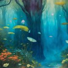 A surreal forest scene filled with vibrant, oversized mushrooms and ethereal trees. Misty light filters through, creating a magical atmosphere in shades of blue, green, and soft pastels.