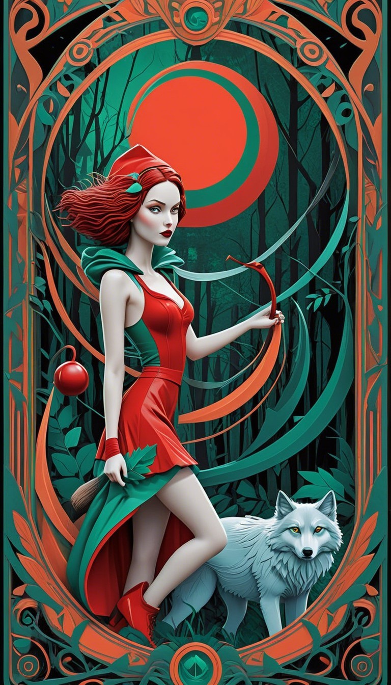 A stylized character reminiscent of Little Red Riding Hood stands confidently in a lush forest, dressed in a red cloak. Two whimsical animals, a red fox and a white wolf, accompany her.
