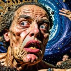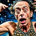 A surreal scene depicts a man with wild hair and an exaggerated expression, surrounded by whimsical, floating robotic spheres against a vibrant, oceanic backdrop.