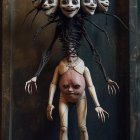 The image depicts a surreal figure with exaggerated features, pale skin, and intense blue eyes, emerging from a wooden frame, surrounded by skeletal hands. The scene evokes a haunting, eerie atmosphere.