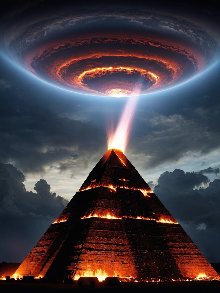 Colossal Pyramid with Fiery Light and Dark Clouds