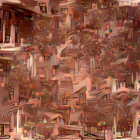 The image depicts a surreal, densely populated urban landscape with towering, precariously stacked buildings, lush greenery, and a misty atmosphere, evoking a sense of chaotic yet vibrant life.