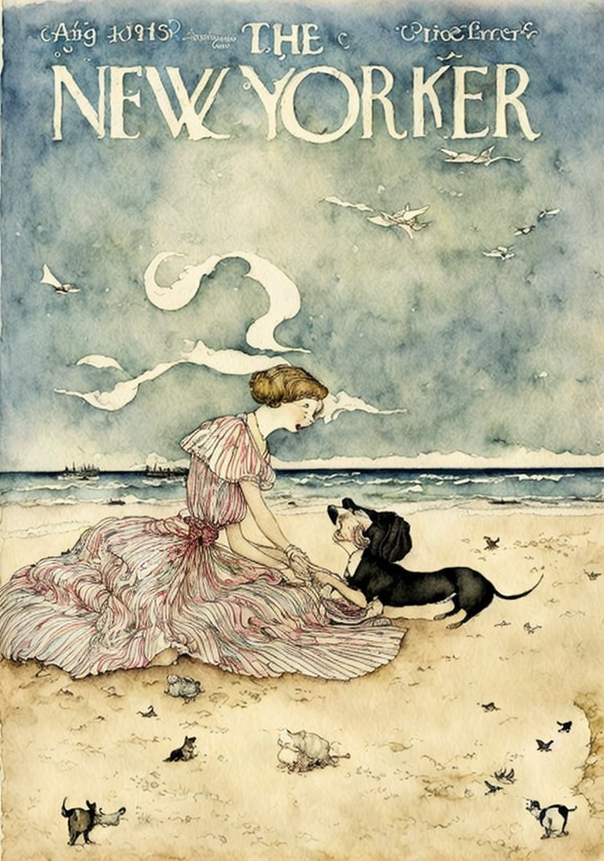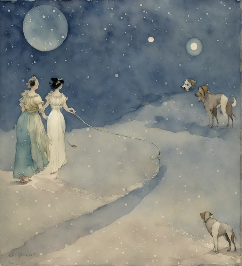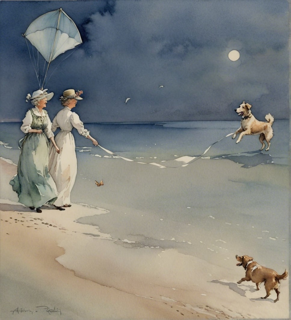 Two elegantly dressed women stroll along a moonlit beach, holding umbrellas and flying a kite. A playful dog runs joyfully at the water's edge, capturing a serene seaside moment.