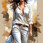 Confident Woman in Stylish Outfit Against Abstract Backdrop
