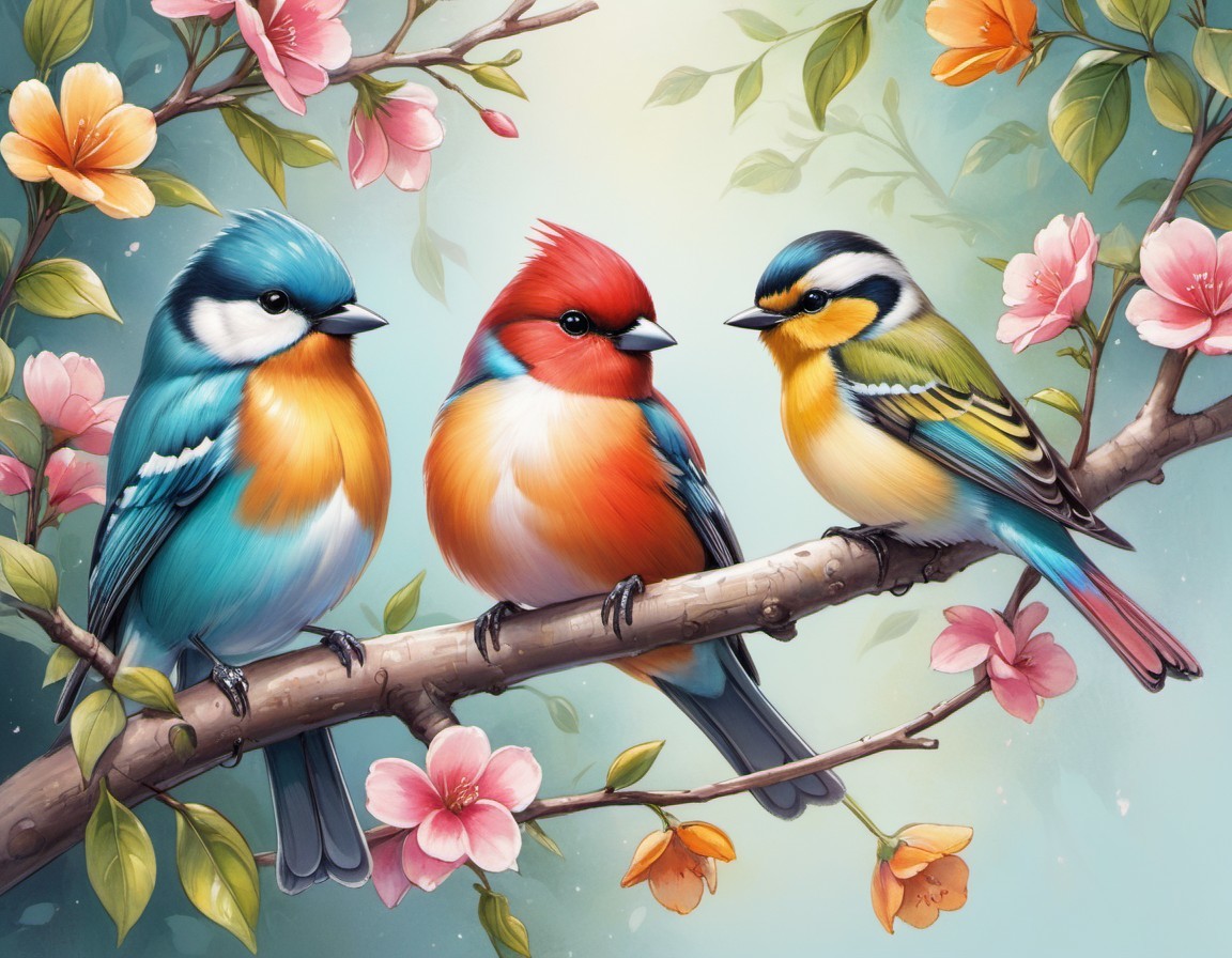 Colorful Birds Perched on Branch with Pink Blossoms on Soft Blue Background