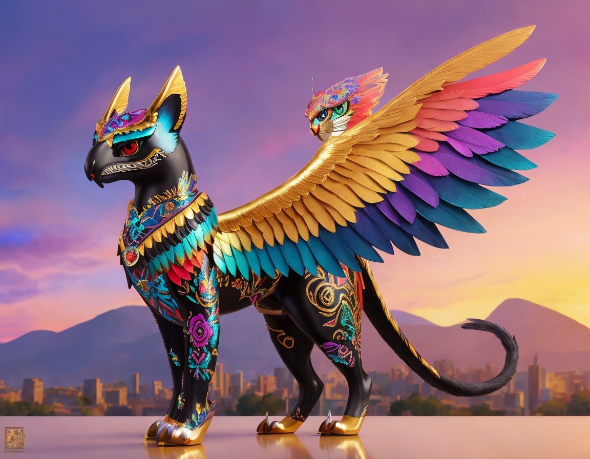 A vibrantly colored, mythical creature with wings, resembling an Alebrije, stands before a sunset and mountains.