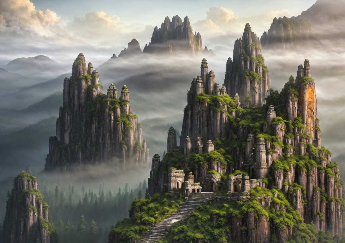 Ancient stone temple atop misty mountain, abandoned aura, intricate carvings, moss-covered, towering mountains in haze, dramatic sunlight rays piercing clouds, mystical atmosphere, rugged terrain, solitary setting, ancient ruins, overgrown vegetation, subdued earthy tones, atmospheric lighting, mystical and mysterious, digital illustration, high detail, fantasy realism, by Studio Ghibli artists, Artstation.
