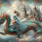 A mystical scene features a serene woman in a flowing blue gown, riding a vibrant dragon against a backdrop of a majestic castle surrounded by swirling clouds and a tranquil sea.