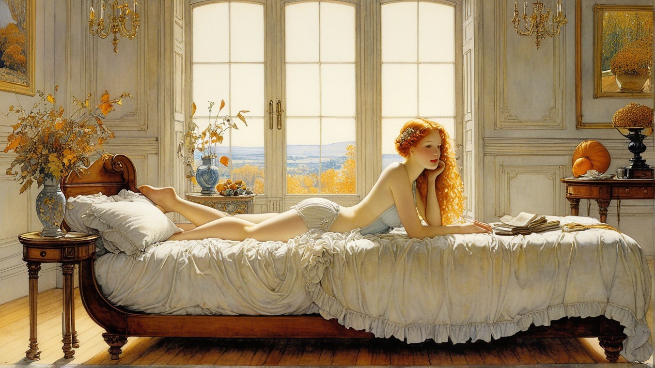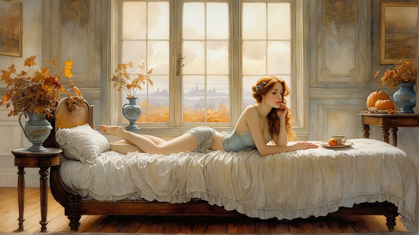 A serene woman lies on a bed, gazing thoughtfully out of large windows. Soft autumn light illuminates the room, adorned with warm colors and elegant decor, creating a tranquil atmosphere.