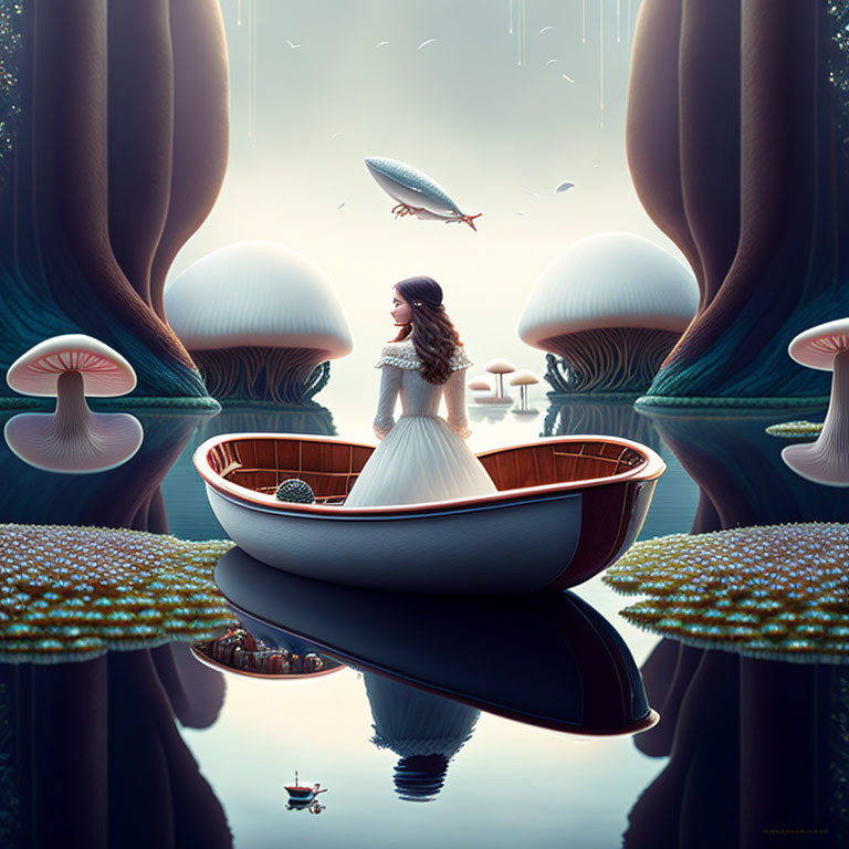 a scared woman in a boat in a white lake among flying fish and giant mushrooms