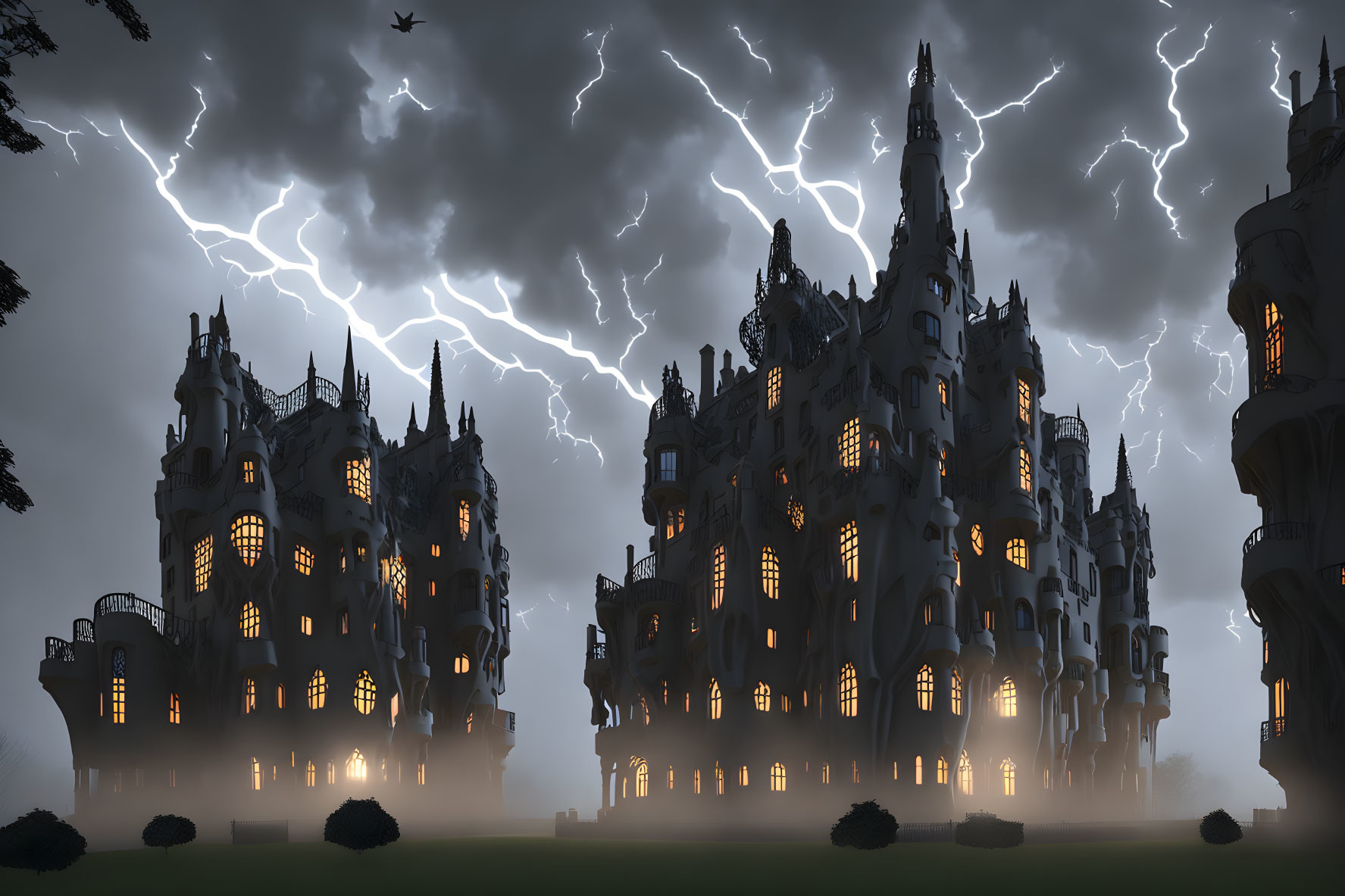 Prompt: + Make the mansion in a distinct Antonio Gaudi style with red-lit widows and the overall scene should be dark and black. Intricately detailed clouds with a silver lining, a bloodbath in the scene. misty fog, a flying bat and a hooded figure, and flashes of lightning in the scene