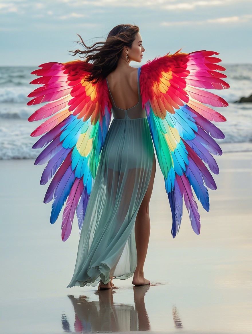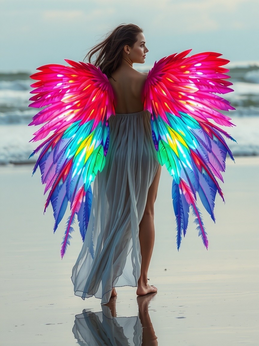 A woman stands on a beach, dressed in a flowing, translucent gown. She has vibrant, multicolored wings resembling feathers, contrasting beautifully with the gentle waves and soft sky.