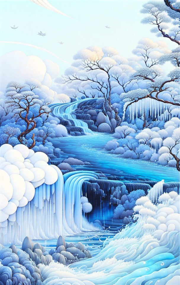 Black and white and blue riverscape with rapids, waterfall, fantastical surrealistic, elegant, wispy clouds, beautiful high definition acrylic art, sunrise, watercolor patchwork, vibrance colors, in the style of Esao Andrews, Ivan Bilibin, Daniel Merriam, Jacek Yerka, 3D line art, Zentangle style, artstation, extremely detailed, intricate, beautiful, award winning, fantastic view, fantasy, elaborate, HDR, fractal, crisp quality,