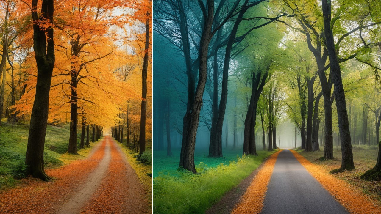 A scenic split view of two forest pathways: one lined with vibrant autumn leaves in warm orange tones, and the other shrouded in cool mist with lush green foliage, evoking contrasting seasonal moods.