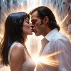 A passionate moment between two individuals, gazing into each other's eyes, ready to kiss. The background features a burst of light, adding an ethereal glow to the romantic scene.