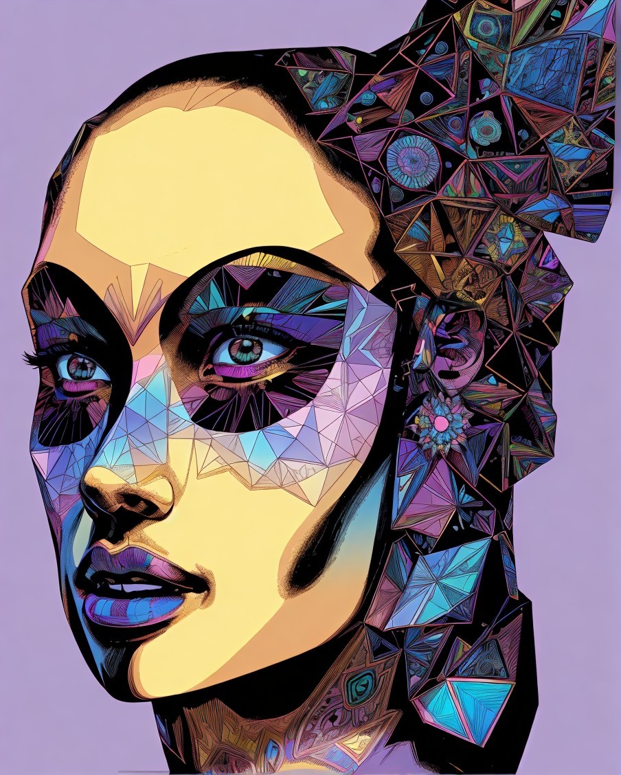 Geometrical colorful portrait of a rockette, side view, comic book art in style of Moebius and Jodorovsky, brightness 1.4, high coloring 1.3, geometrical illustrative style, Pastel colors of blue reddish-brown yellow,, crisp quality, vector 9:5, intricate stylized hairstyle, zentangle method, dry brushed paint, comical sketch art, beautiful composition 1.9, tints of pop art, eerie, spiritual essence, coffinwood 1.7, american gothic 1.7, dynamic lighting 1.7, 3d effects 1.8, ambient occlusion 1.5, anisotropic filtering 1.7, raytraced shadows 1.8, chiaroscuro lighting, ethereal otherworldly scenery, triadic color scheme bkue teal green in background, saturated colors, plasticity 1.6, stylized lineage illustration, geometrical features, anatomical accuracy, sharp, somber, vivid illumination, iridescence 1.4, zentangle method, octane render, plasticity 1.9, complexion 1.4, radiance, illustrative maximalism, psychedelic psychpomp scene,