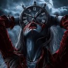 Gothic Woman in Dramatic Costume Before Oversized Clock