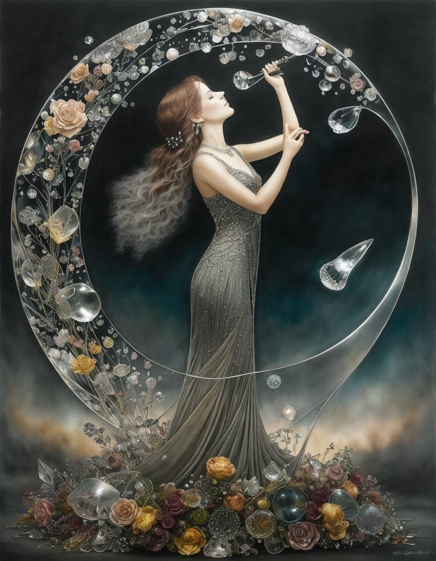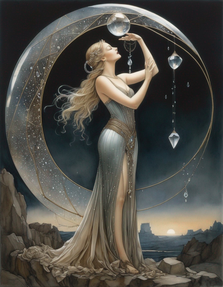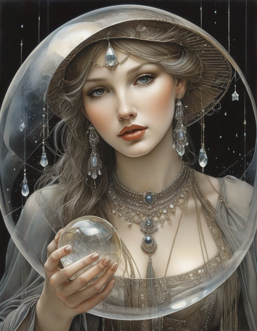 A painting of a regal woman with pale skin and elaborate jewelry holding a transparent orb with a mountain scene inside, set against a moon backdrop.