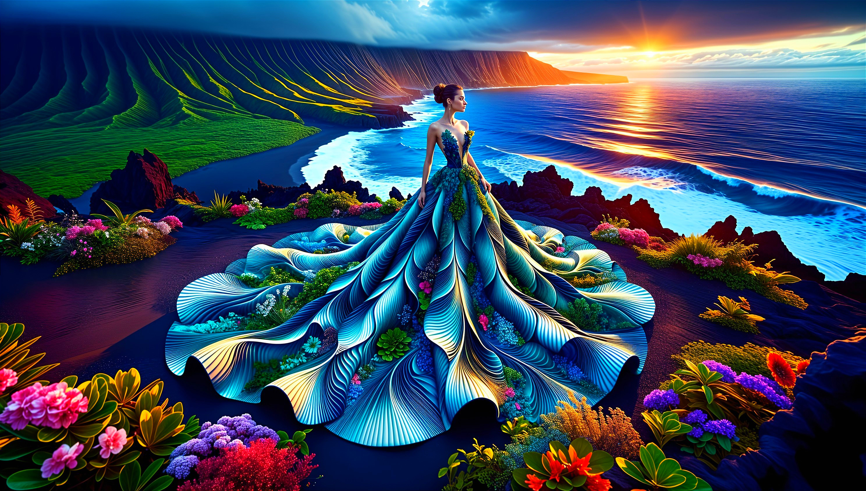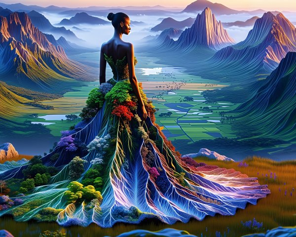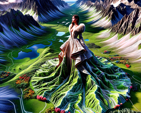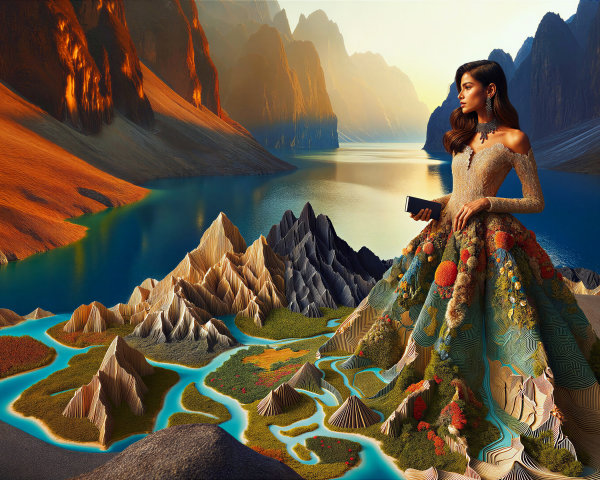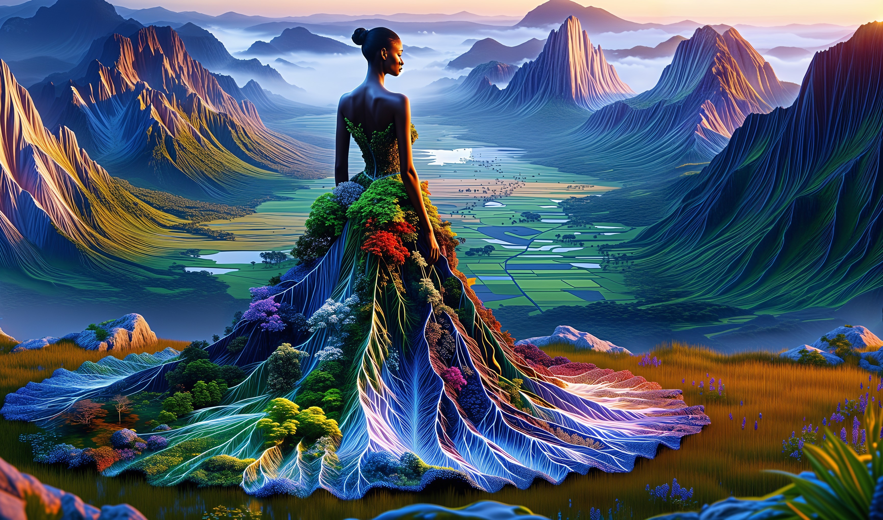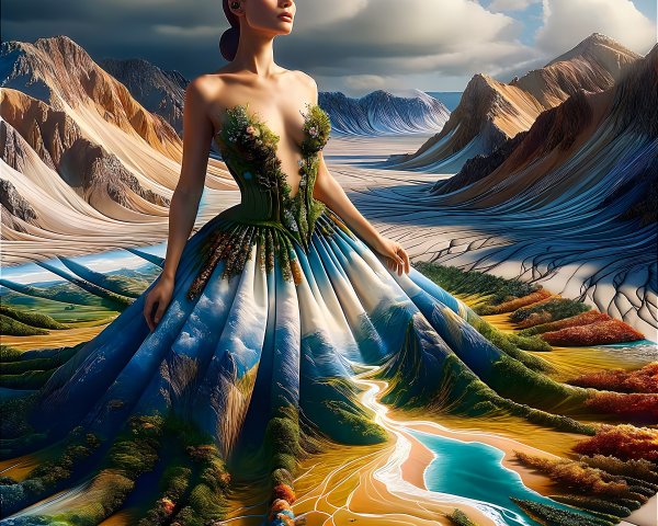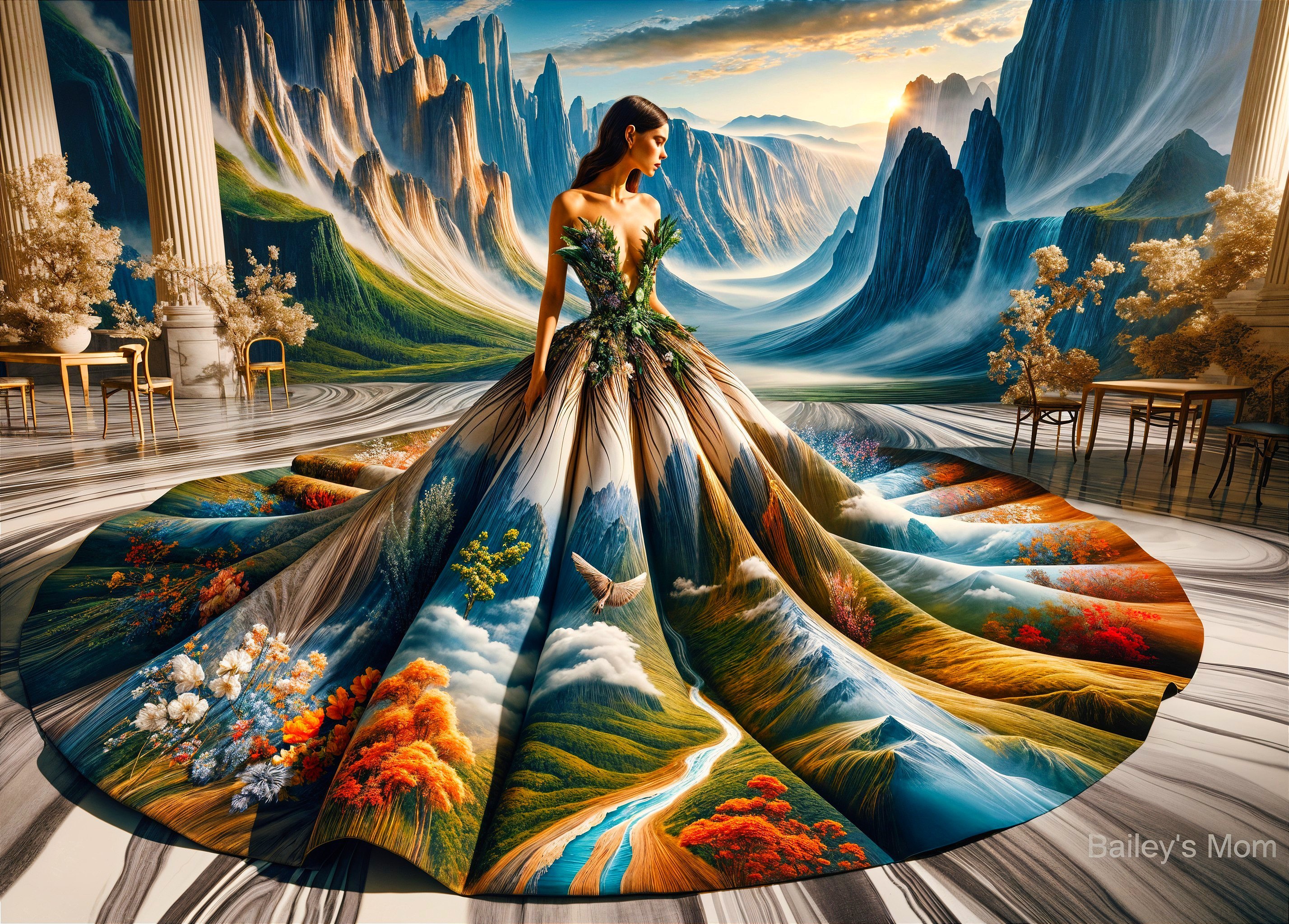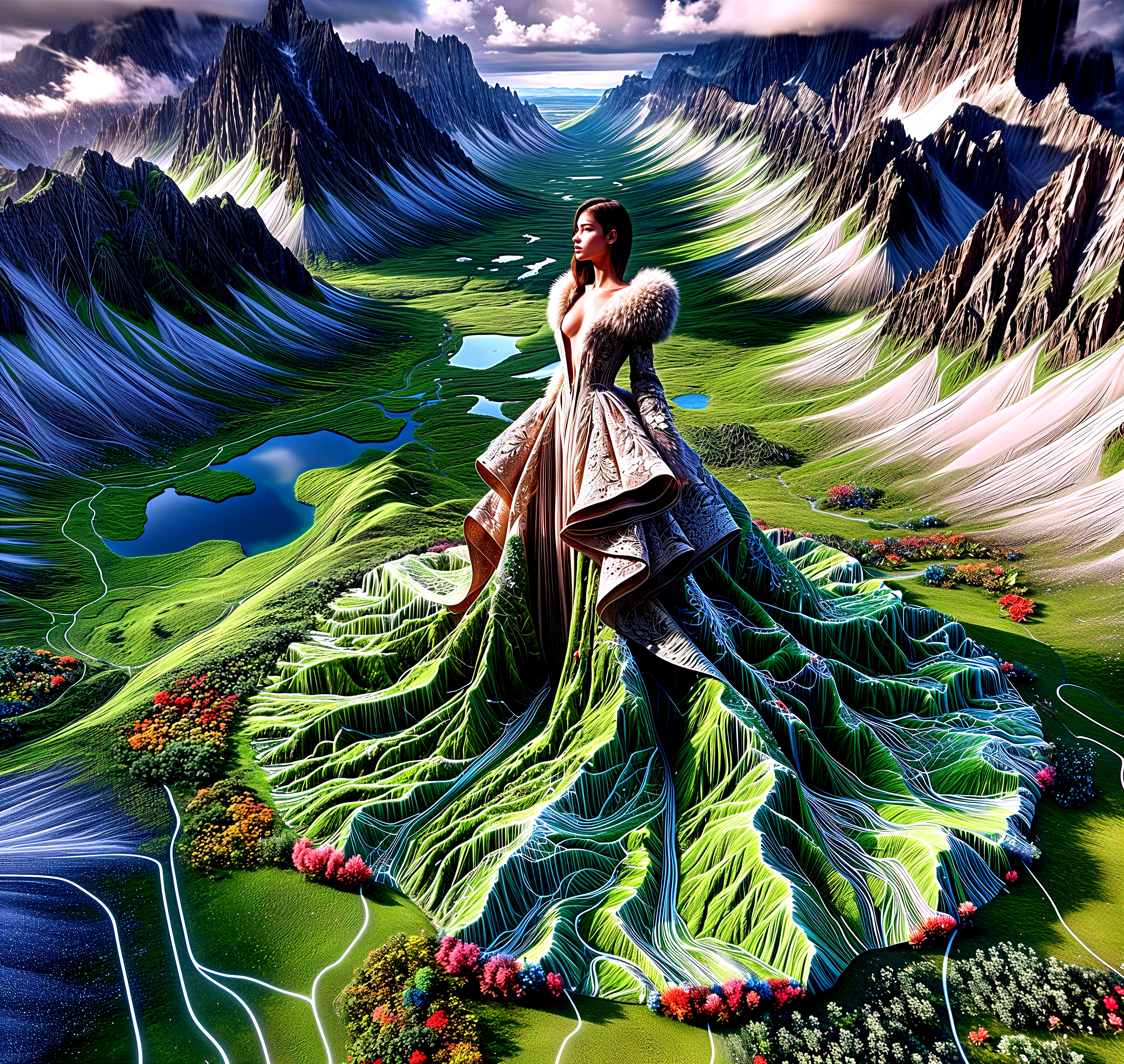 Prompt: Hyper detailed, intricate, immersive intersect ion of super realistic detailed breathtaking scenery, expansive sublime surreal fashion that is the actual scenery worn by a model, based on future high fashion technology & the visionary genius of fashion icons and tech gurus, the gorgeous model is amid natural scenic landscapes, she wears a 3d topographic expansive gown that is itself made of 3d scenery that ties into the landscape, the landscape elements and dress are mountains, valley, rugged terrain, gorgeous flora, all interweaved yet the avant Garde gown is structurally fitted as beautiful fashion and the model is immersed in a stunning location, collaborative work of art, technology, they are each gorgeous destinations & creations that fuse into a transcendent masterpiece of scenic textiles, fashion is both a location and a form of worn art, unconventional , in the collaborative & mind blowing styles and expertise of Yves St.Laurent, Christian Siriano, Valerie Lamontagne - (AMFI) & 3lectromode, Sahrye Cohen - Amped Atelier, Vladimir Fedotko, Kenzie Housego - Phi Illuminated Designs, Neri Oxman - MIT Media Lab, Christo and Jeanne-Claude, Steven Spielberg, Vogue Fashion, National Geographic, Cyril Rolando, Microsoft,, Steven Meisel Teruya; Steve McCurry , caspar david friedrich, Jacek Yerka Hyper quality, magic hour, wide angle, 32k 500 plx, Vladimir Fedotko,,beautiful expressive face, realistic wide-set eyes, fwell-lit face, windy, mysterious, earthy, vivid, Abstract Neoralism, cinematic, Film light, Hyper detailed, Hyper realistic, masterpiece, atmospheric, High resolution, Vibrant, 8k, HDR, 500px, FUJIFILM,
