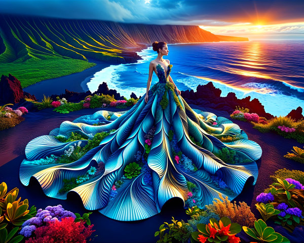 A serene landscape merges with a fantastical gown, featuring vibrant floral patterns and intricate textures. The model stands thoughtfully by a shimmering lake, surrounded by majestic mountains.