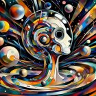 A vibrant, abstract composition features a stylized human skull amidst swirling colors and dynamic shapes, embodying themes of cosmic exploration and consciousness expansion.