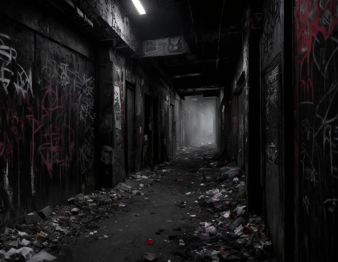 Prompt: "Dark alley setting, gritty urban environment, abandoned buildings, dimly lit, ominous atmosphere, drug addiction theme, syringe injecting substance, smoke swirling, tourniquet visible, urban decay, trash scattered on ground, graffiti-covered walls, eerie shadows, dramatic lighting, high contrast, intense colors of red, black, and gray, detailed realism, digital art, evocative and unsettling, by Banksy and Francis Bacon, Artstation."
