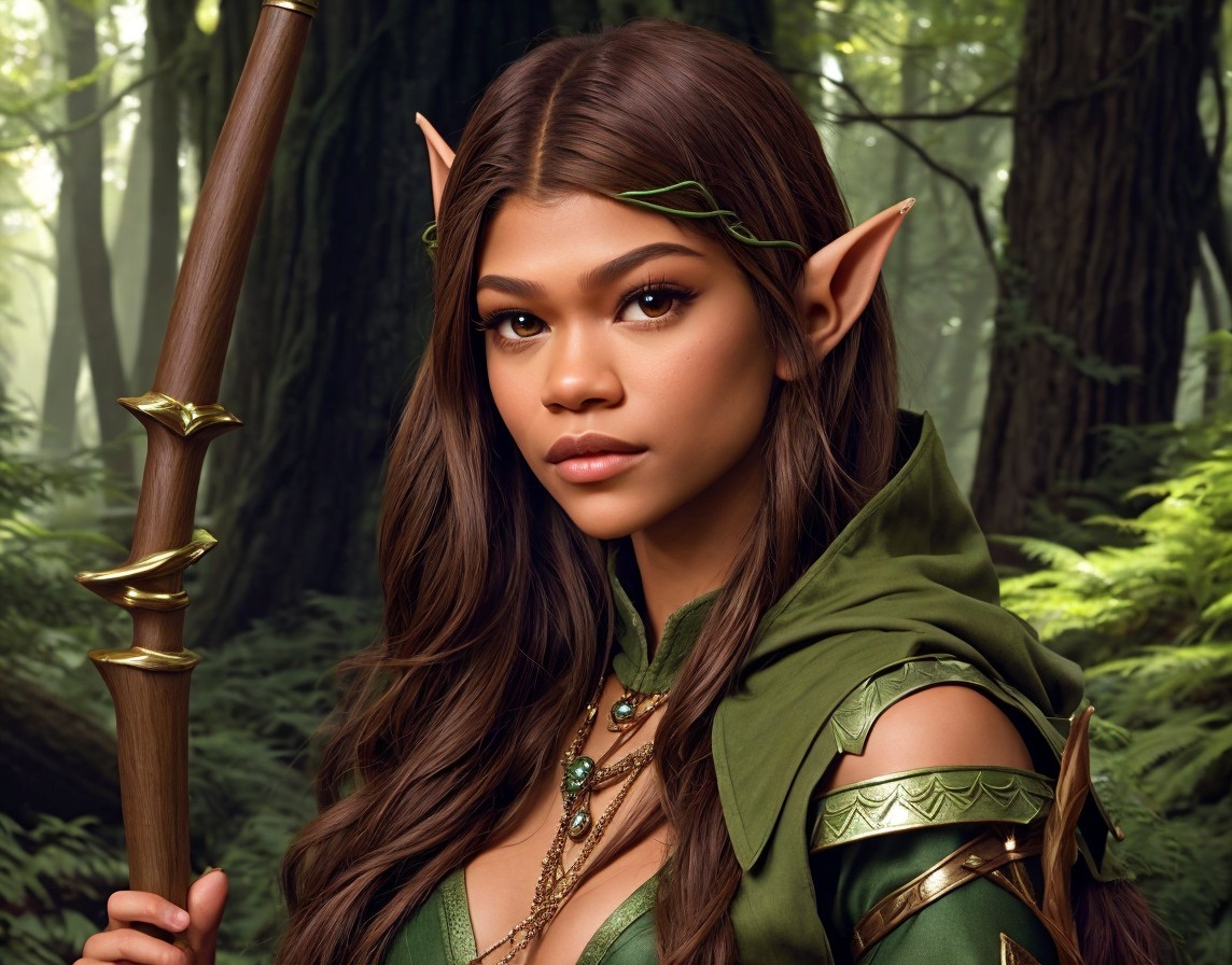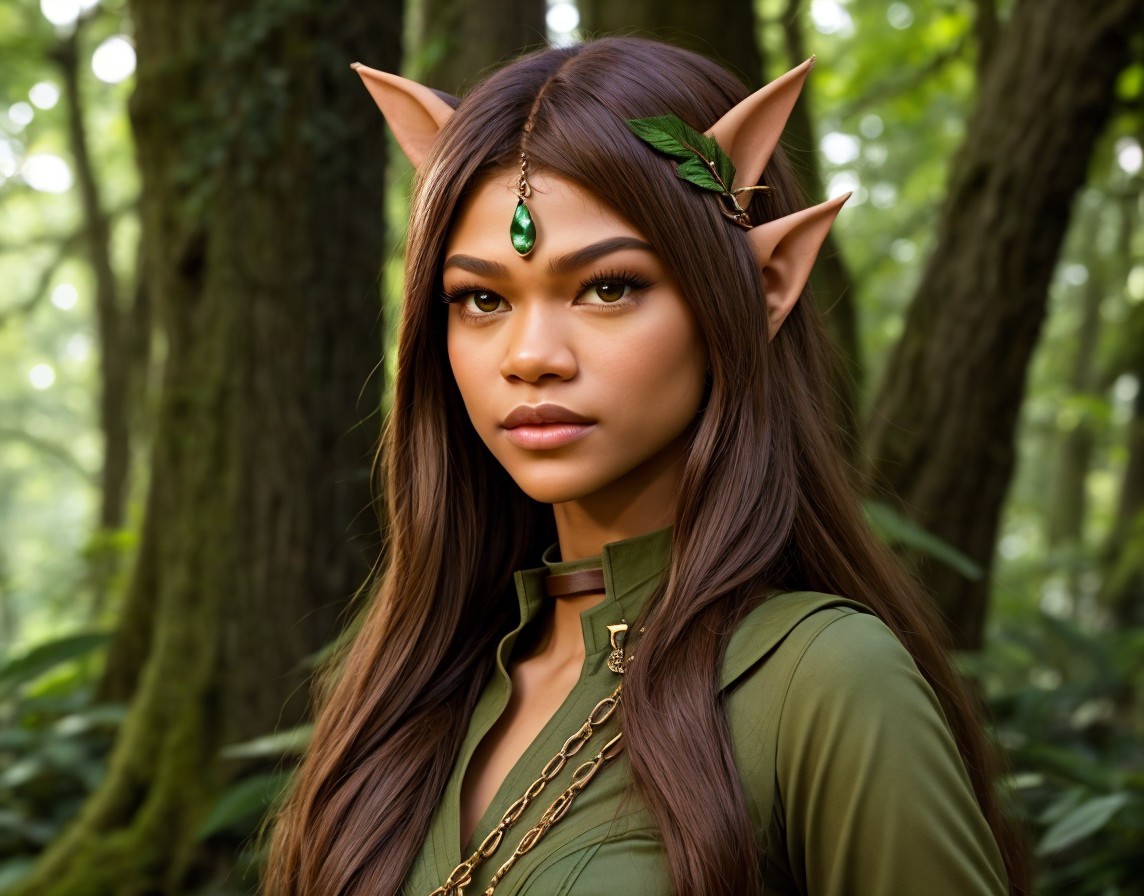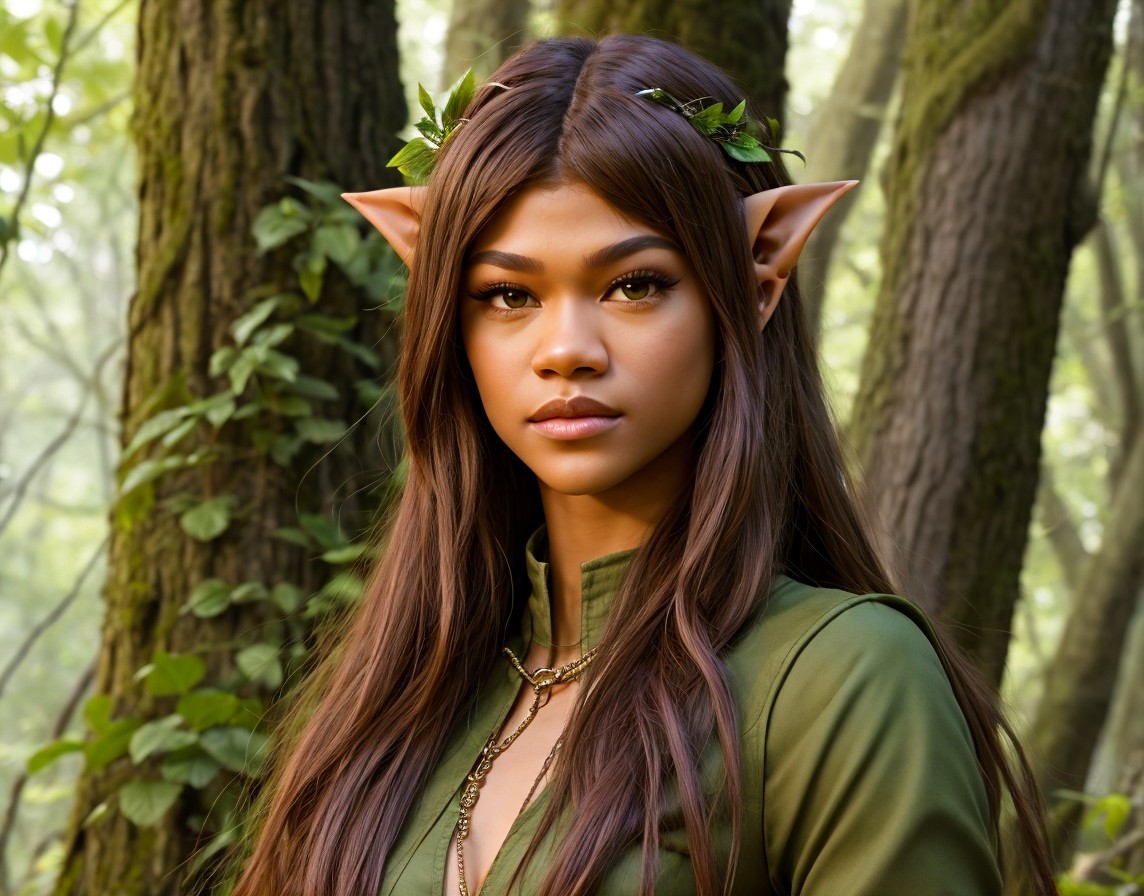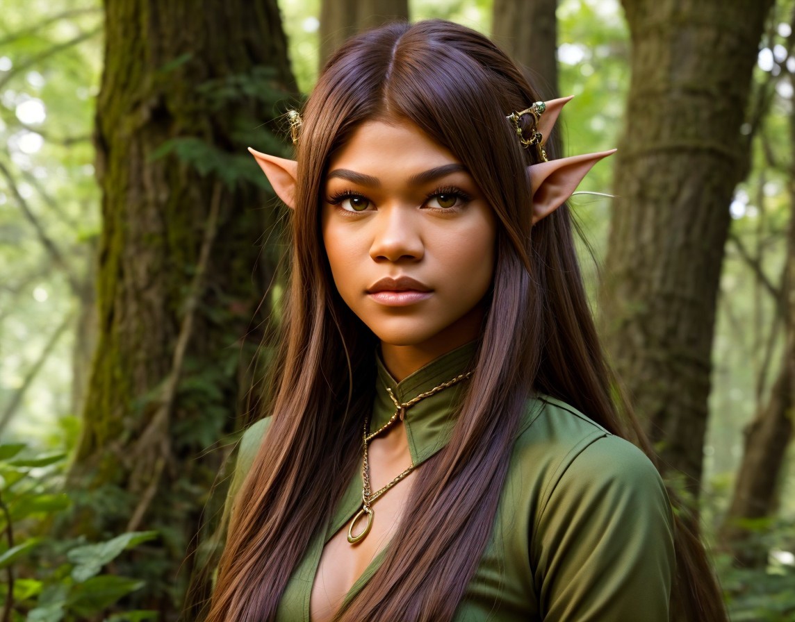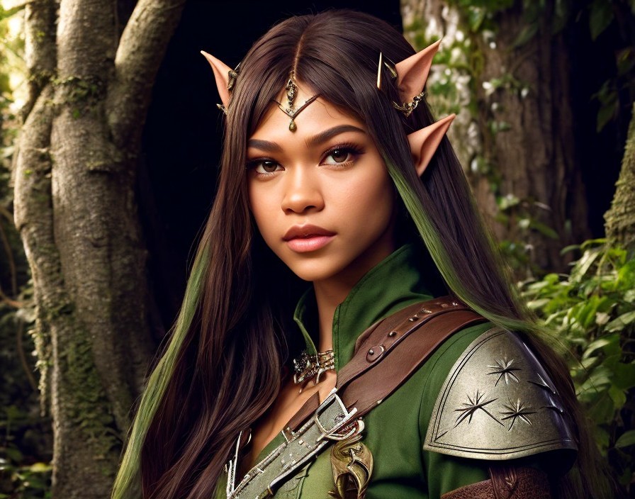 This image depicts a fantasy elf character with pointed ears, adorned with a headpiece and surrounded by an enchanting forest backdrop.