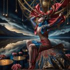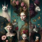 A surreal, ethereal composition featuring mystical women adorned with intricate crowns and floral elements, accompanied by elegant cats and butterflies, all set against a dreamy background.