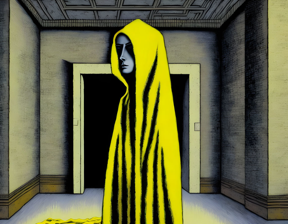 Bright yellow draped figure in room with patterned walls and stripe-like shadows