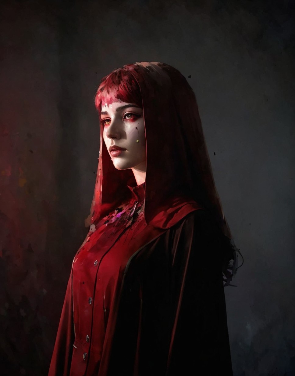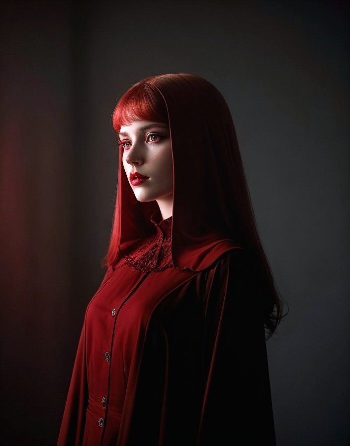 A young woman in a deep red cloak and hood gazes thoughtfully to the side. Her elegant features and striking makeup enhance the dramatic, moody atmosphere of the portrait.