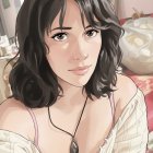 Woman with Hibiscus Flower Against Colorful Sunset Waves