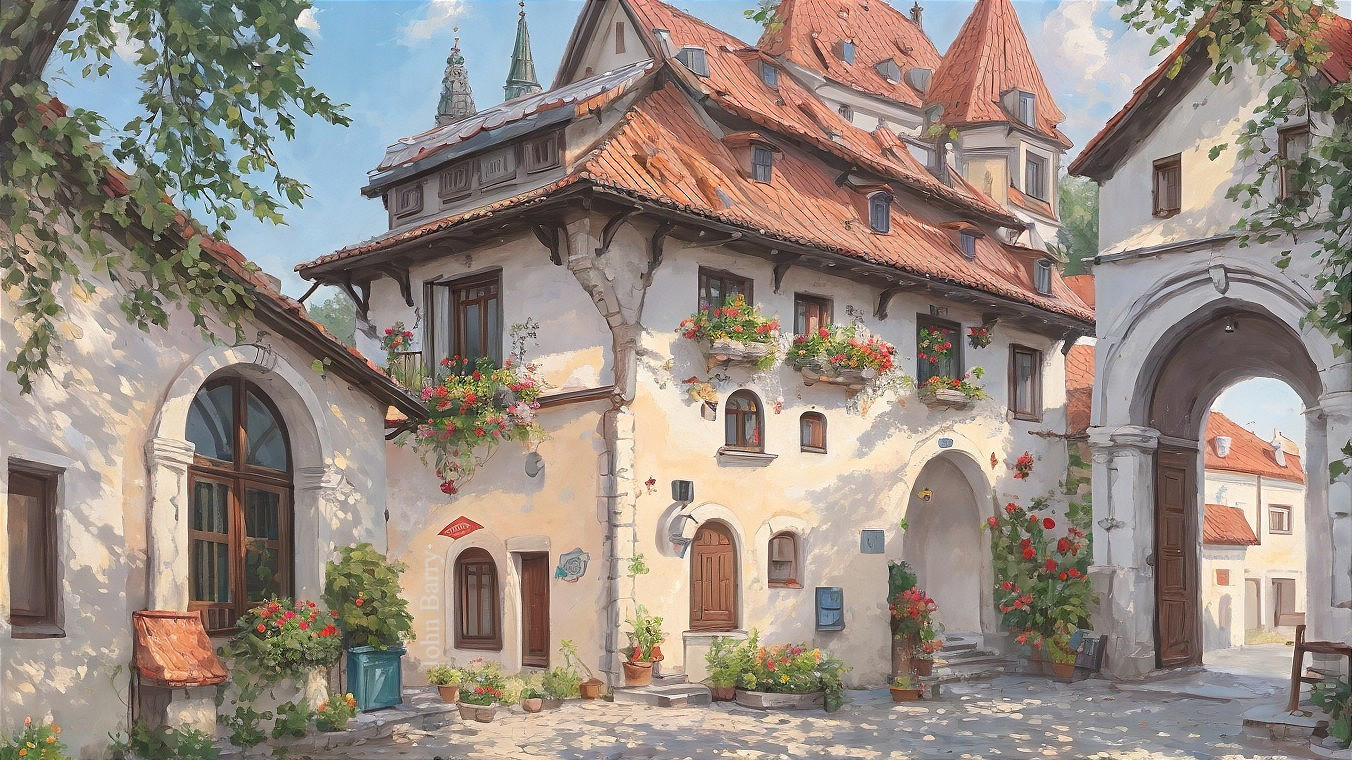 European-style buildings with red flowers in window boxes, cobblestone street, and a clear sky.