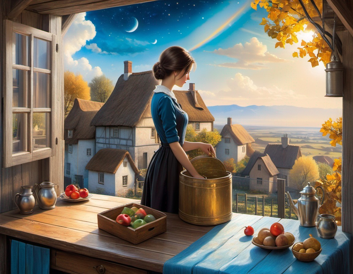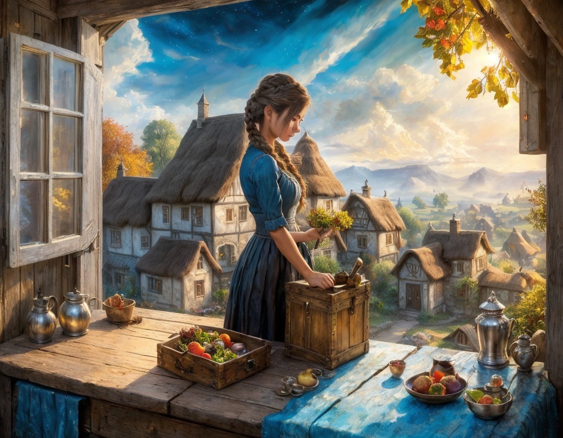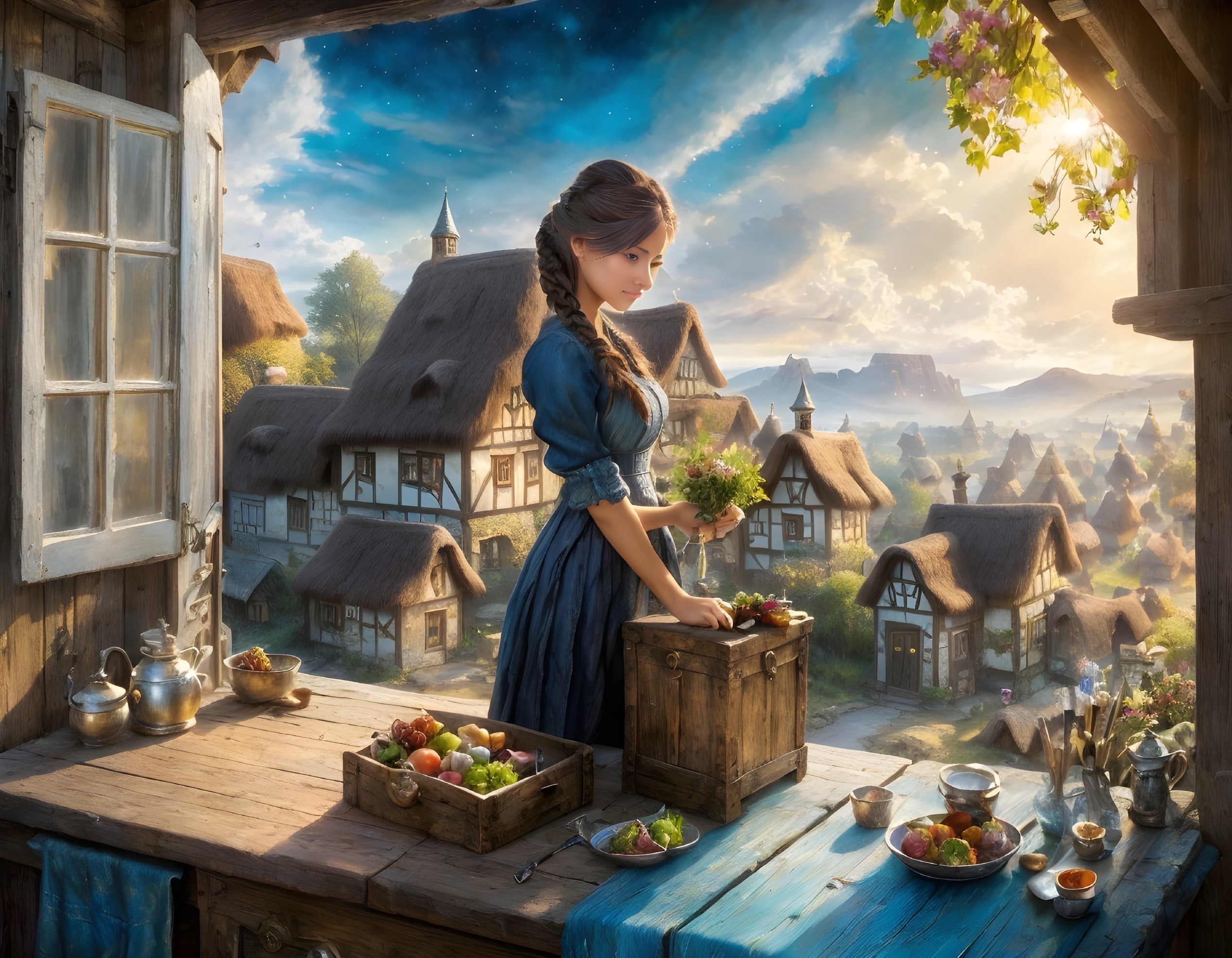 + Prompt:A little magic town in a box, standing on an old carved table in a cottage kitchen. magic look, fantastic view. Painting by Tony Sart, Sherry Akrami, Yossi Kotler, Duy Huynh, Steve Hanks, Vincent van Gogh