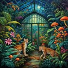 A greenhouse filled with lush tropical plants, colourful flowers, and exotic mushrooms. Two elegant ocelots sit gracefully.