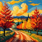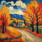 A vibrant autumn scene features swirling skies, golden trees, and a winding dirt road leading past colorful houses. Rich hues of orange and blue create a lively, textured landscape.